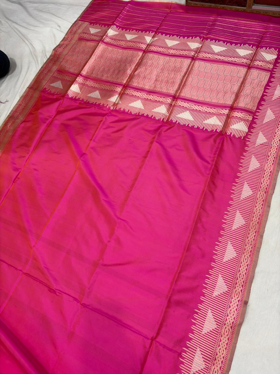 Immerse yourself in timeless grace with this a blend of tradition and sophistication. Woven from luxurious double tone orange pink Pure Katan Silk Banarasi Handwoven Saree, pure Katan silk, this saree is adorned with intricate handwoven patterns and subtle zari detailing, crafted by expert Banarasi artisans.