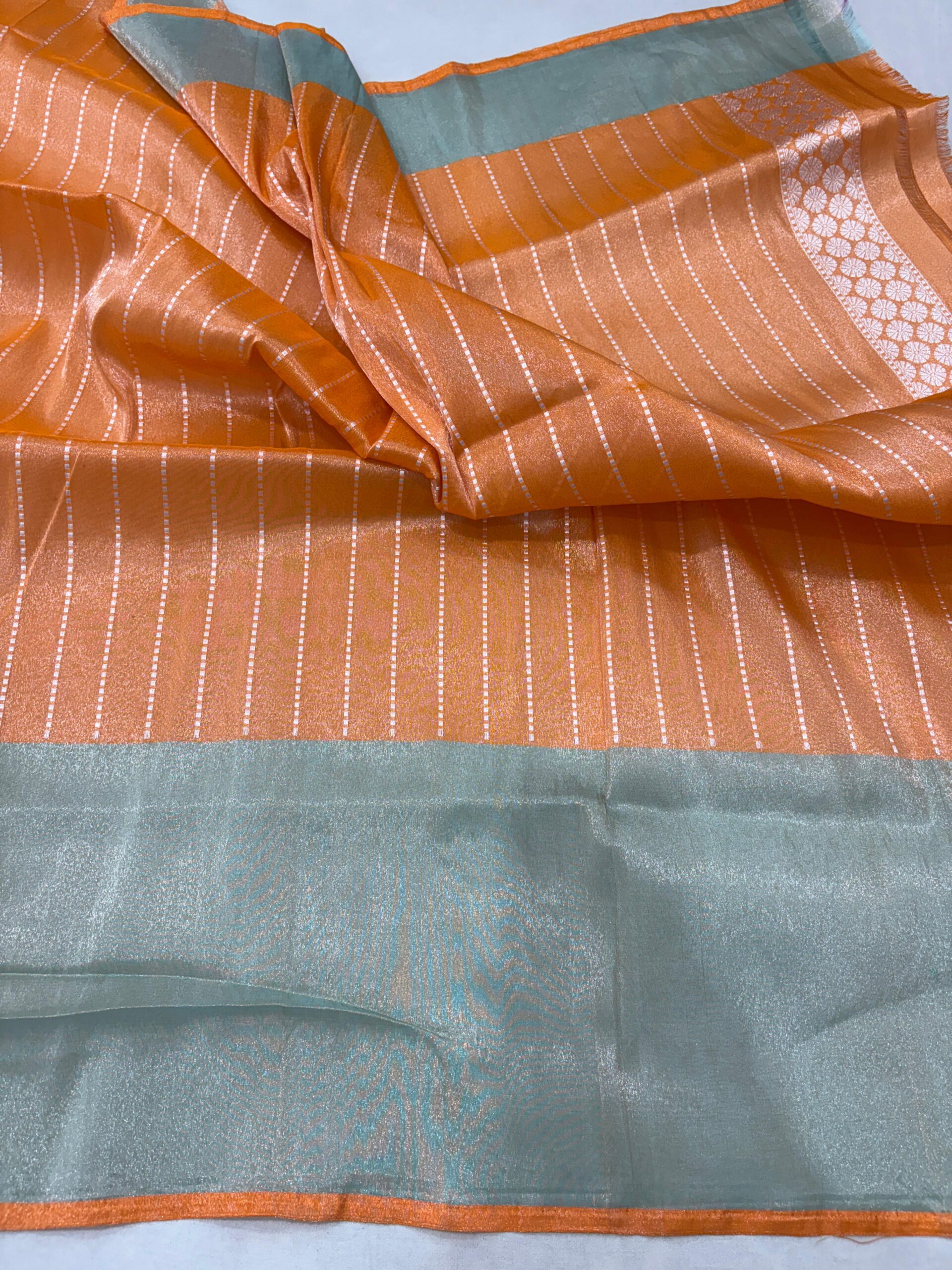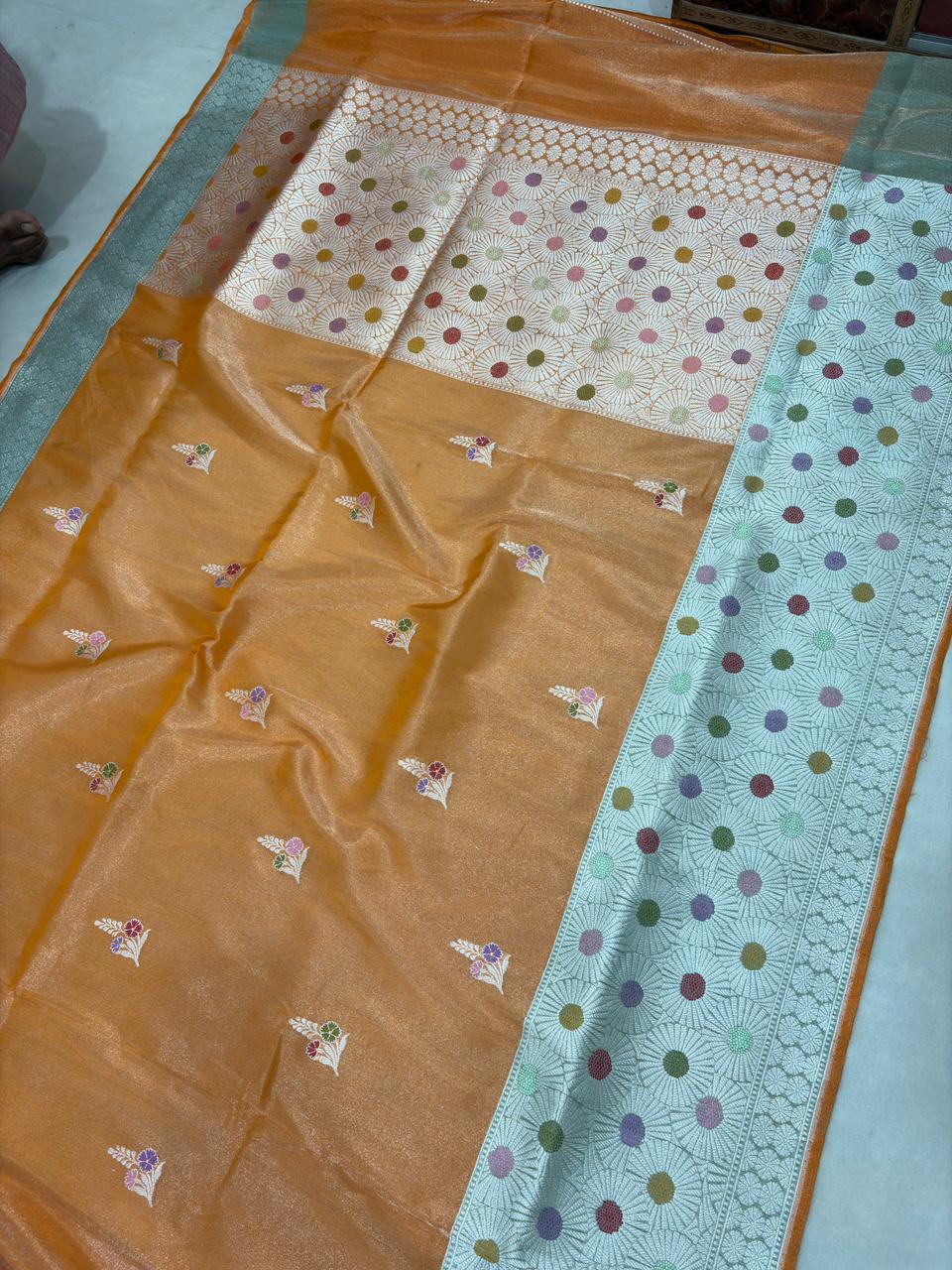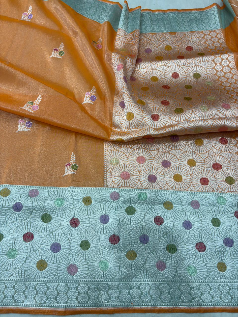 mmerse yourself in timeless grace with this Orange shade Pure tissue Silk Banarasi Handloom Handwoven Kadhwa Sarees, a blend of tradition and sophistication. Woven from luxurious pure Katan silk, this saree is adorned with intricate handwoven patterns and subtle zari detailing, crafted by expert Banarasi artisans.