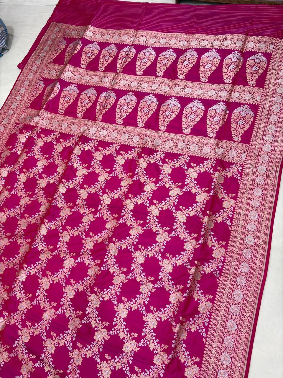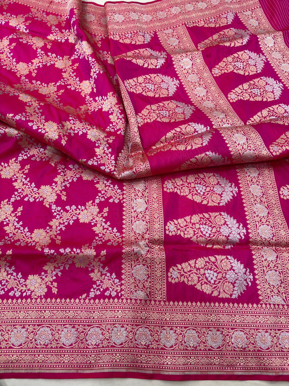 ranipink pure katan silk banarasi handloom handwoven cutwork jaal sarees