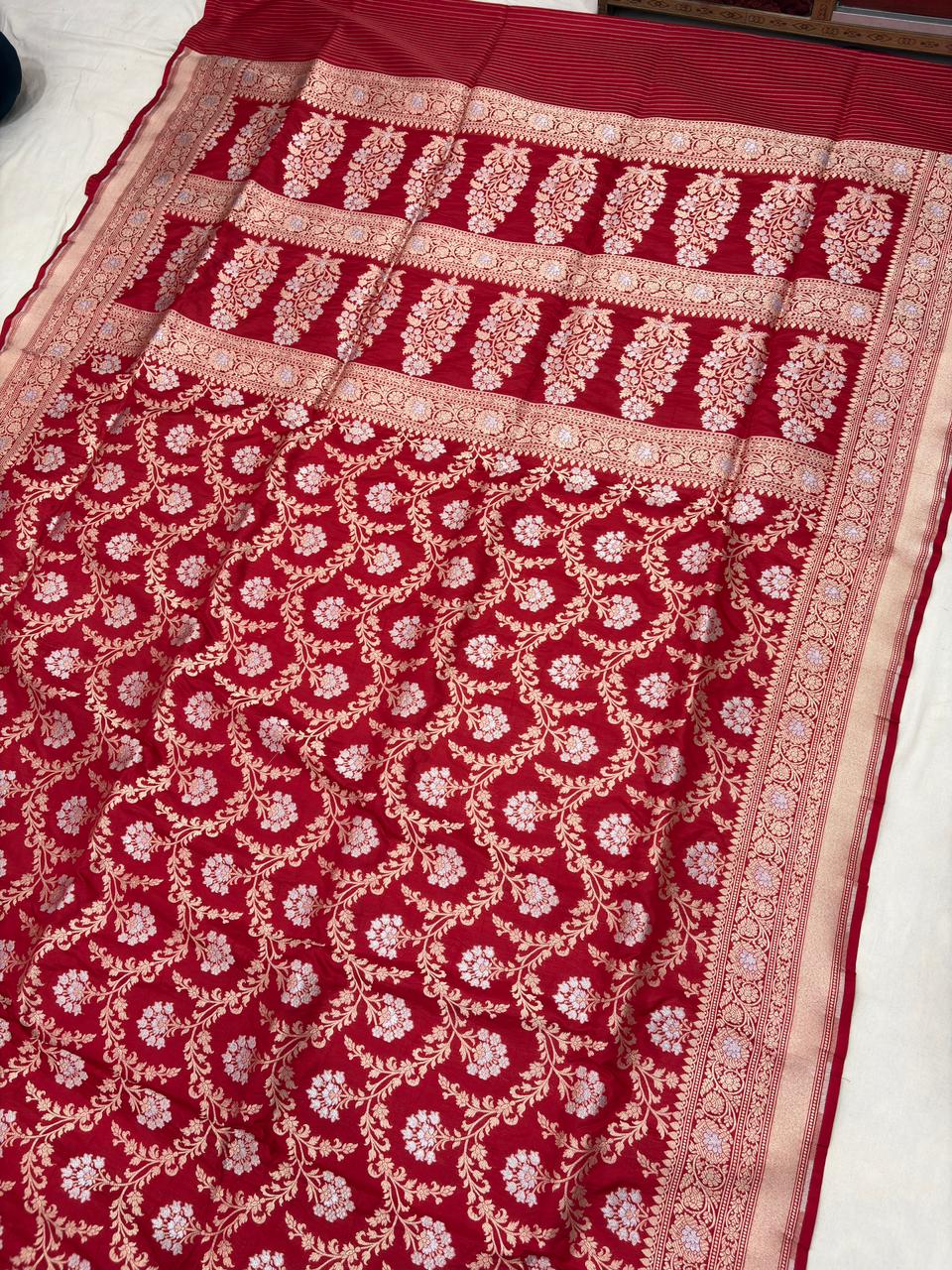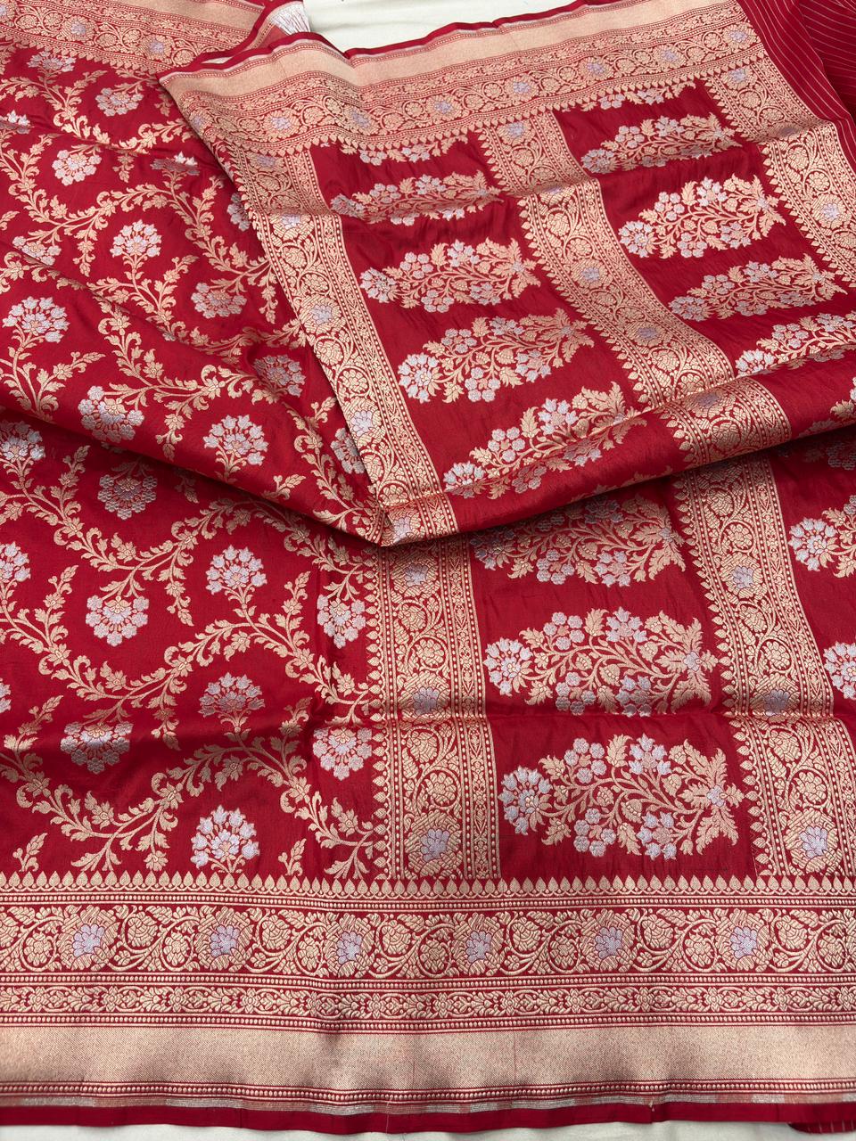 red pure katan silk banarasi handloom handwoven cutwork jaal sarees