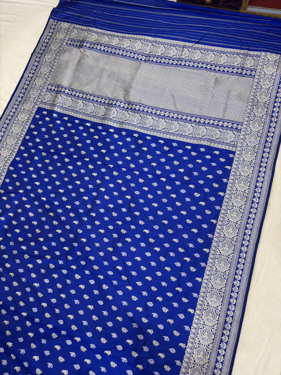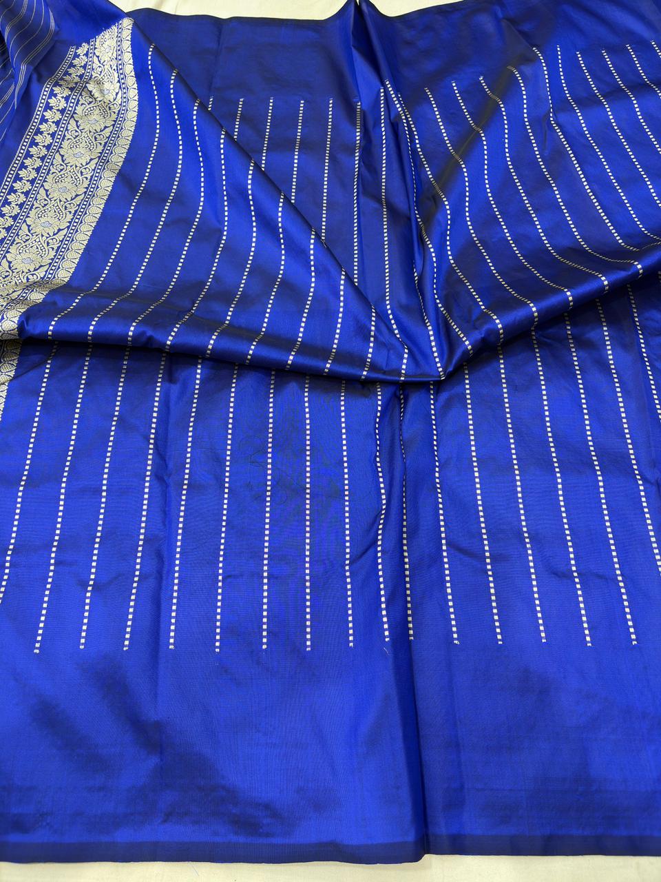 mmerse yourself in timeless grace with this Royal Blue Pure Katan Silk Banarasi Handloom Handwoven Kadhwa Jangla Sarees, a blend of tradition and sophistication. Woven from luxurious pure Katan silk, this saree is adorned with intricate handwoven patterns and subtle zari detailing, crafted by expert Banarasi artisans.