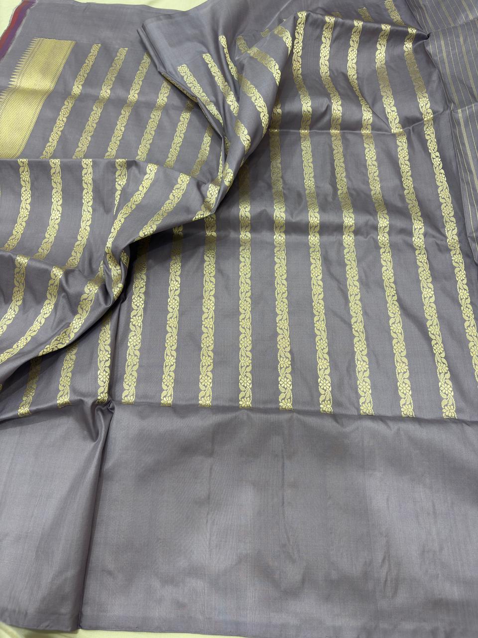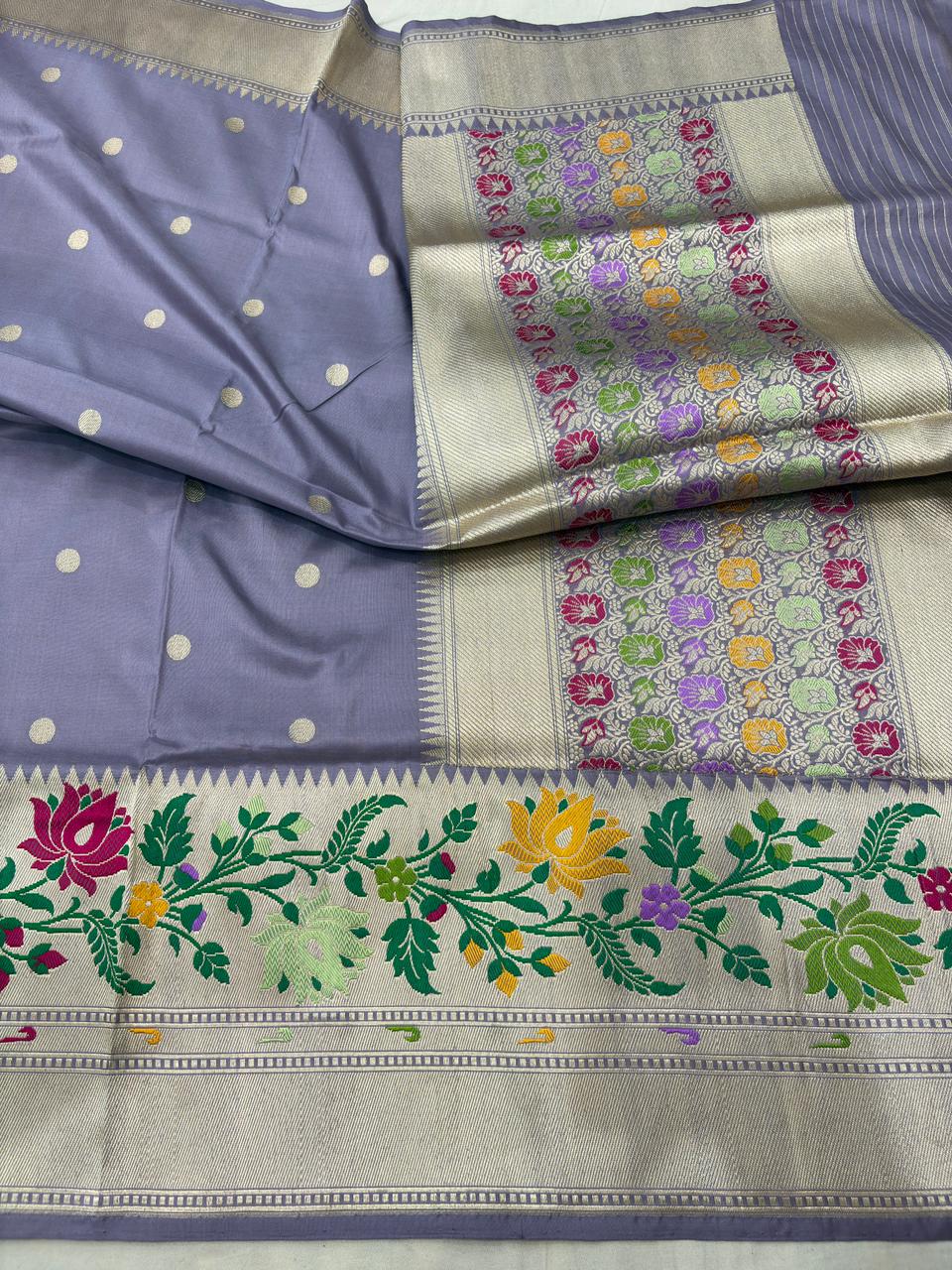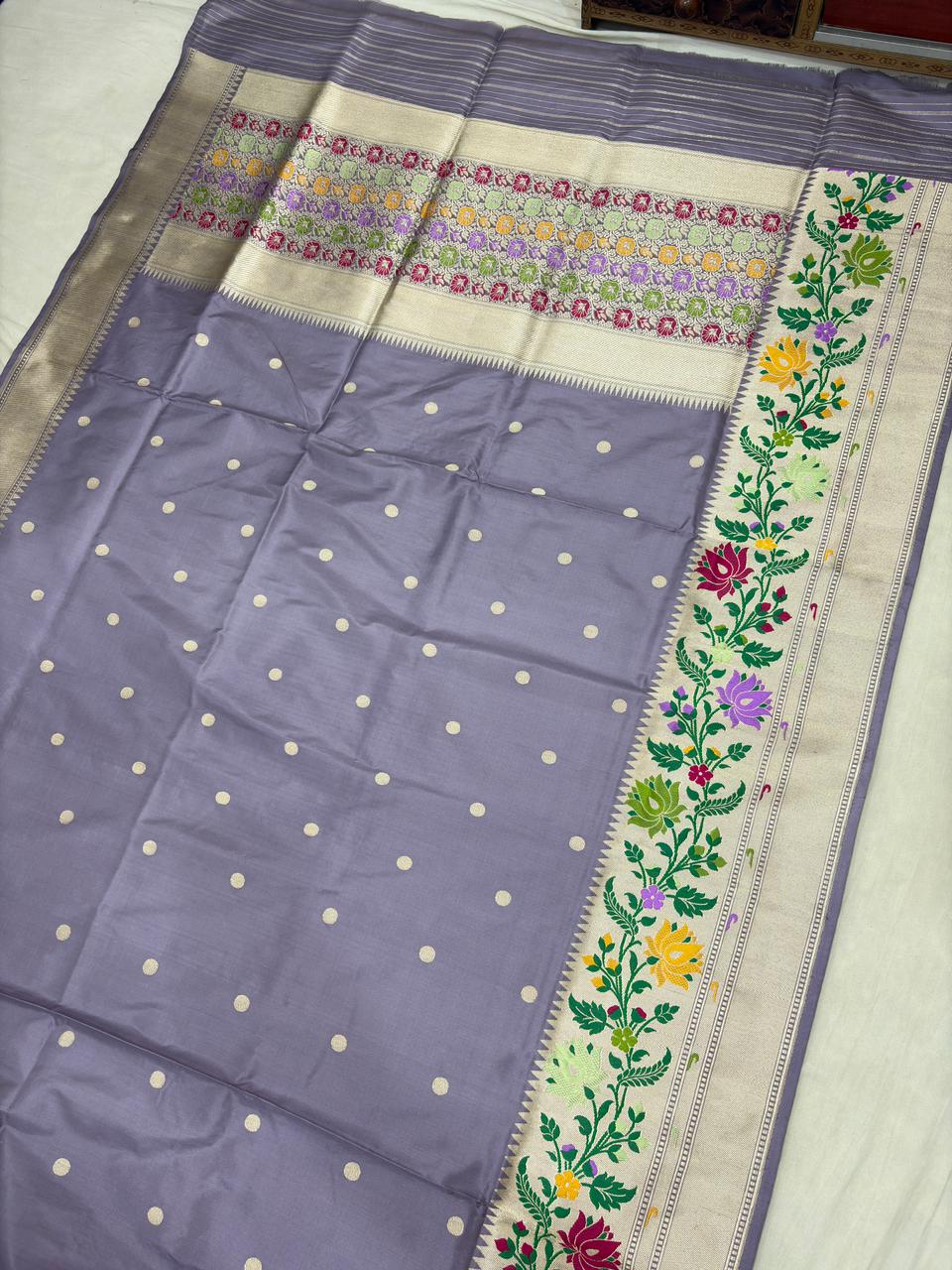 mmerse yourself in timeless grace with this Stunnig Gray Pure Katan Silk Banarasi Handloom Handwoven Kadhwa pathani Sarees, a blend of tradition and sophistication. Woven from luxurious pure Katan silk, this saree is adorned with intricate handwoven patterns and subtle zari detailing, crafted by expert Banarasi artisans.